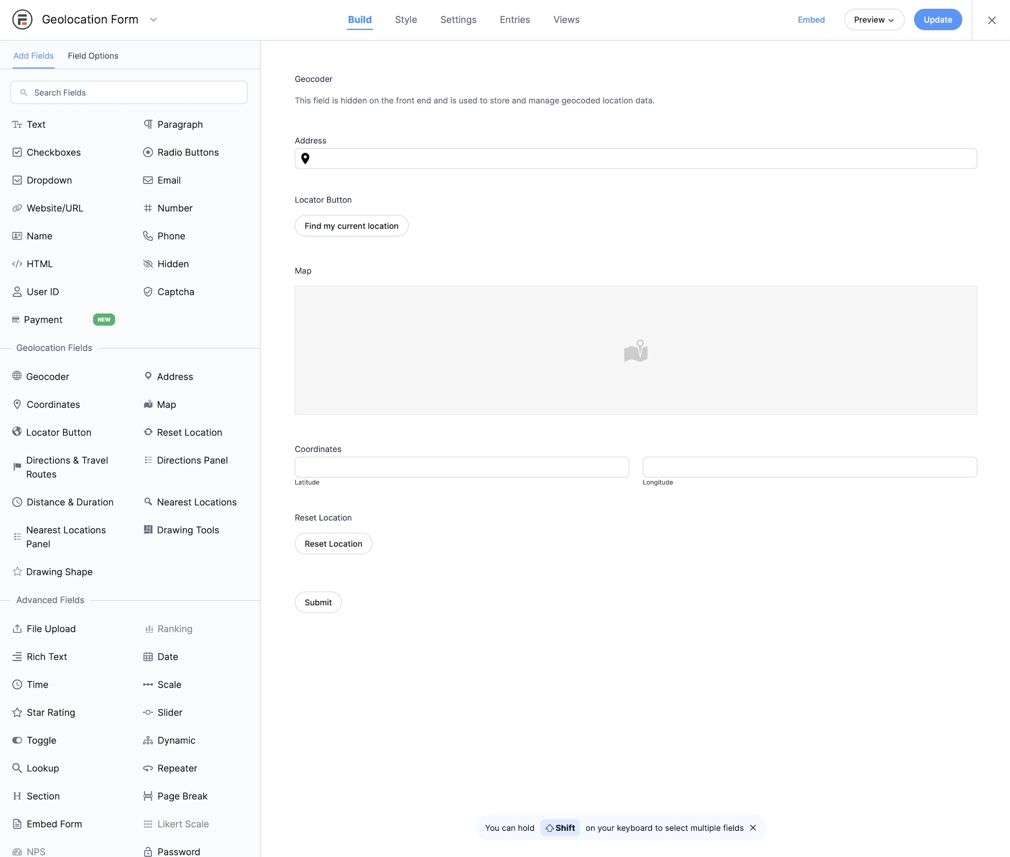 The Geocoder Field acts as the central engine that synchronizes location data between all other geolocation fields. Each additional field, such as theAddress, Map, Coordinates, Locator Button, and Reset Location, connects to the Geocoder Field to ensure accurate and consistent geolocation behavior throughout your form.