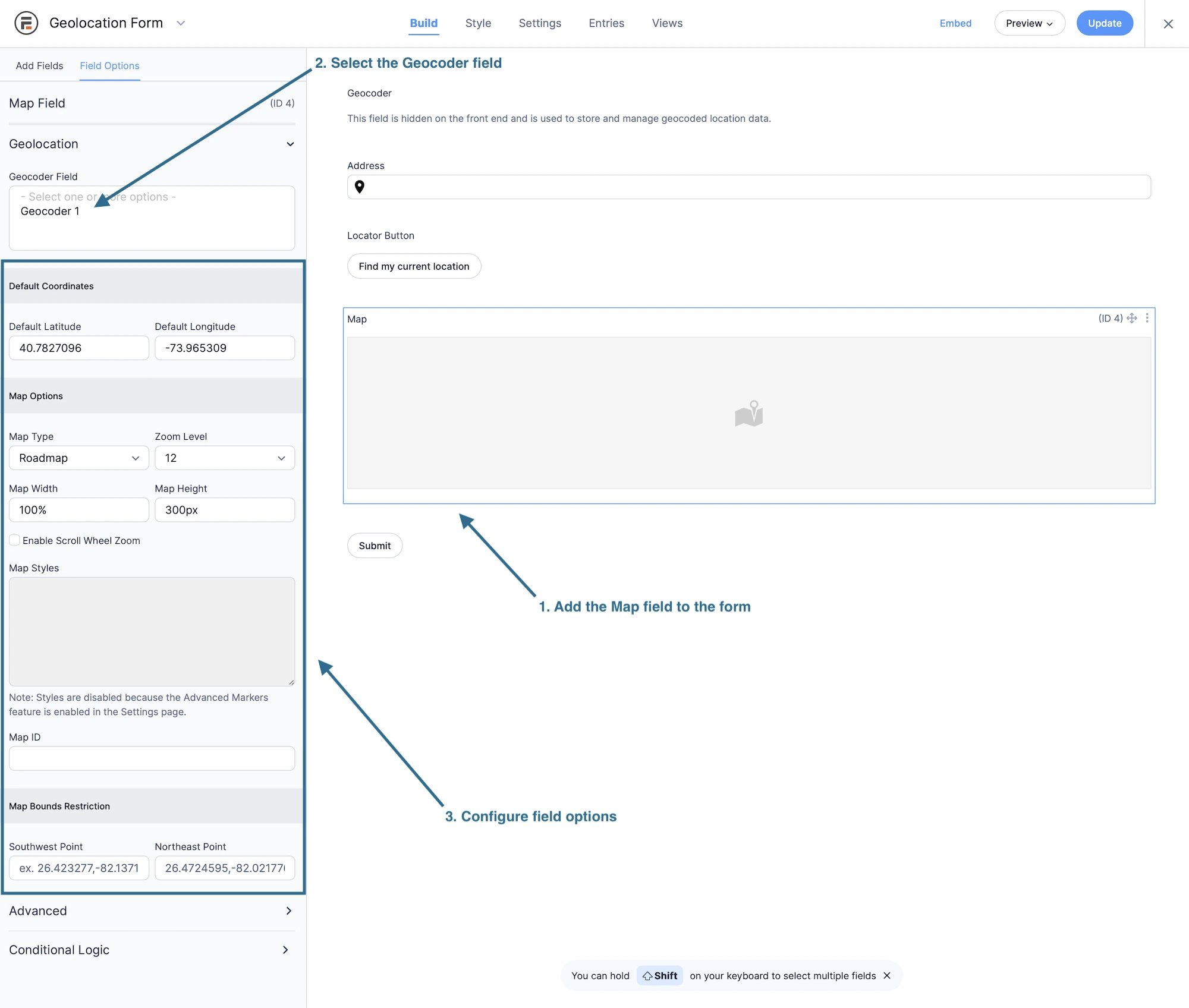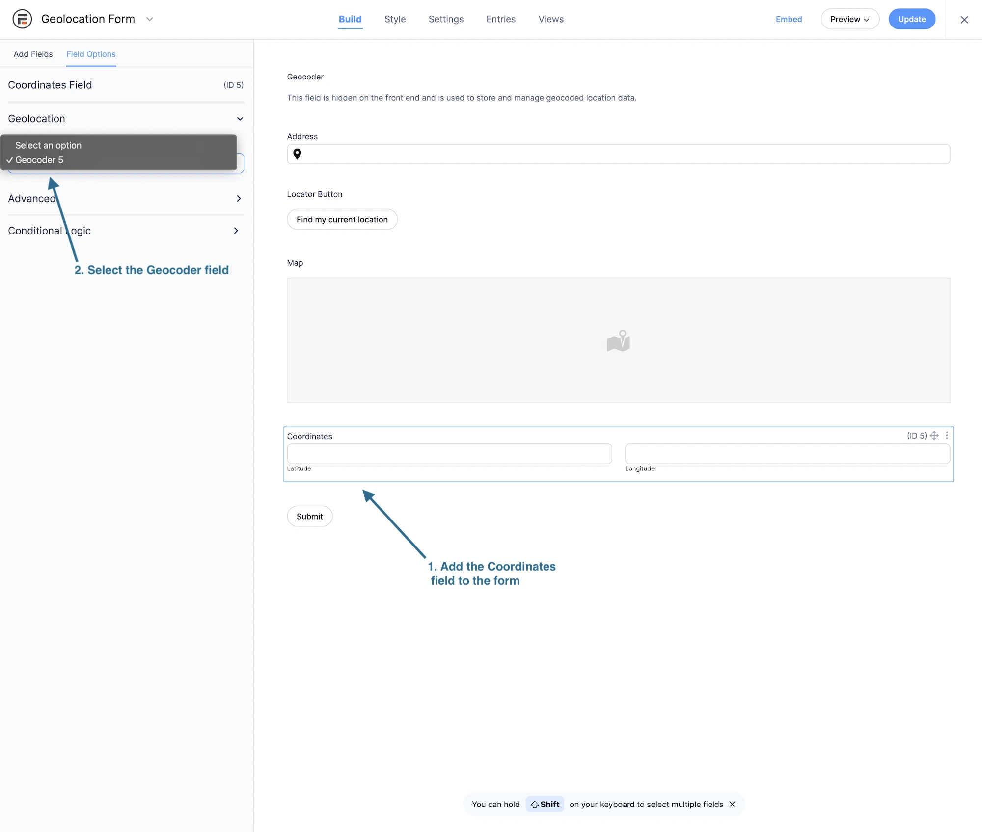 In this guide, we use a Geocoder Field with ID 1 as the example. When creating your own form, be sure to use the field ID that matches your setup.