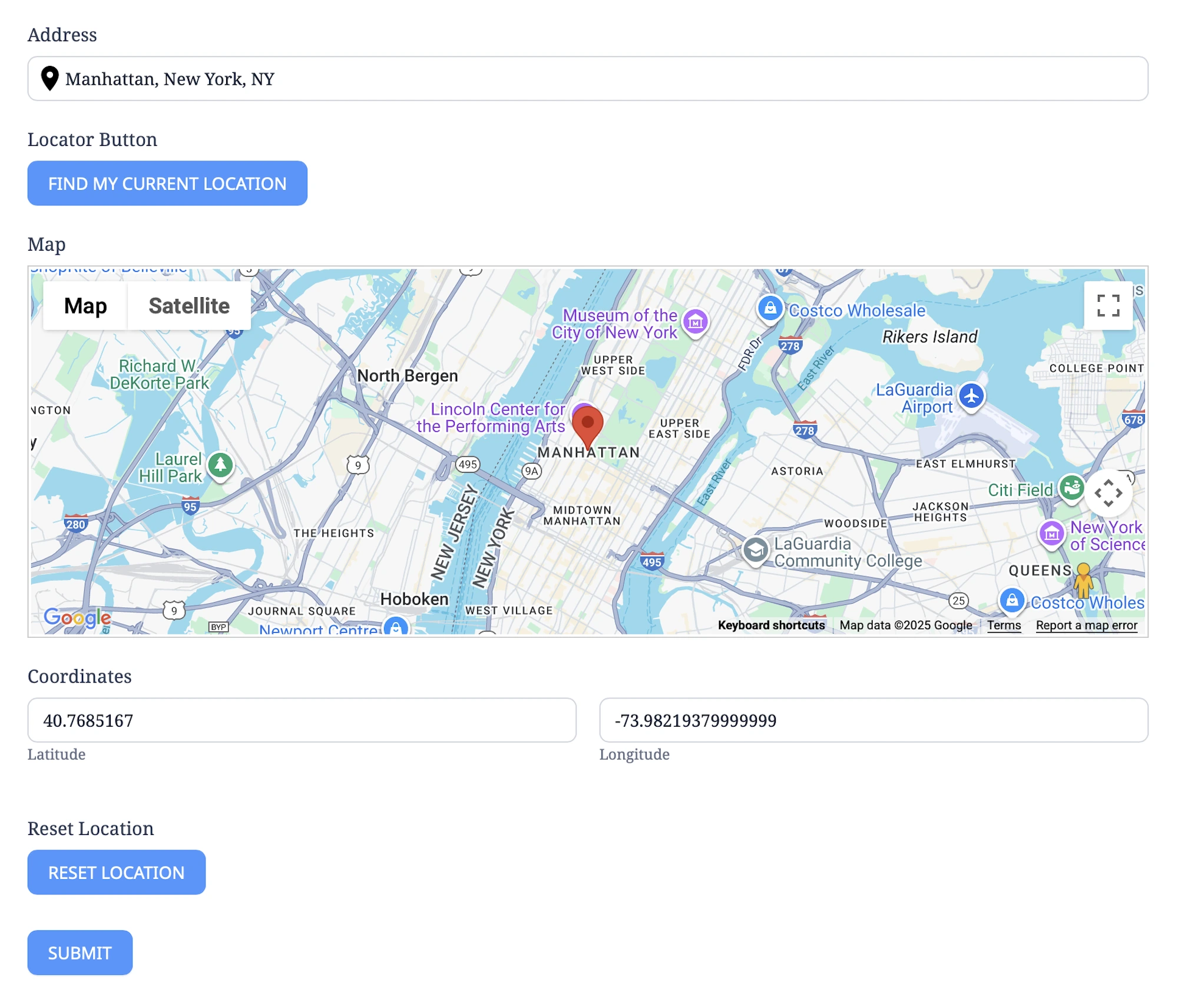 The Address Field allows users to enter or autocomplete an address. When linked to a Geocoder Field, selecting an address automatically updates all related geolocation fields.