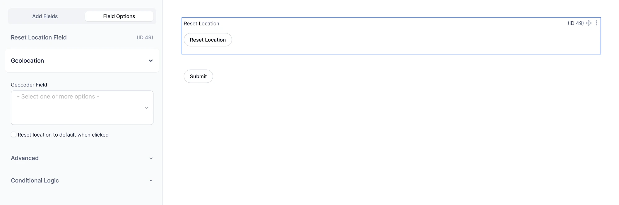 The Reset Location Button Field in Formidable Geolocation gives users a simple way to clear or restore geolocation values in your form. It works with the Geocoder Field and other geolocation fields to reset coordinates, addresses, and map markers back to their initial state, or to a predefined default location if configured.